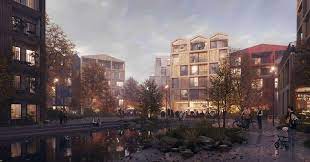 Just outside of the city center in Copenhagen a development is planned that will create 2,000 homes in a new environmentally friendly neighborhood made entirely of timber. With an expected 7,000 residents it has been designed to show how people can live alongside nature, even in a city, and with people emphasized over cars.